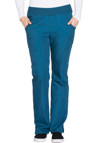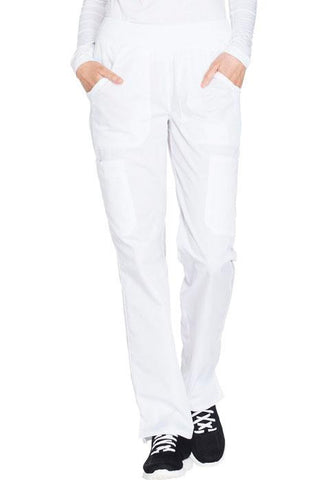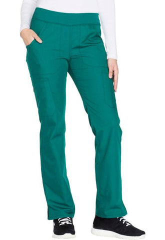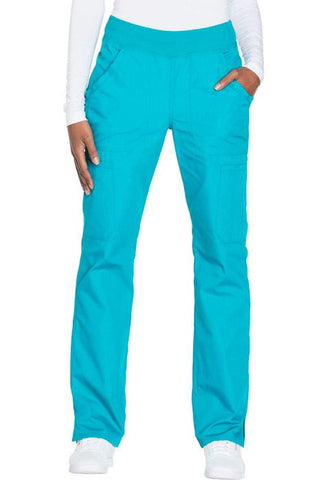 A Contemporary fit, mid rise, straight leg pant features a comfort-fit rib knit waistband reinforced with inside elastic for extra support, and front patch pockets with rib knit insets for expandability without sagging. Also featured are two cargo pockets, a pen slot, hidden instrument loop, back pockets and side vents. Inseam:28 1/2"