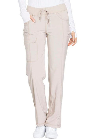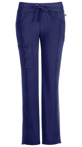 A Contemporary fit, low rise, straight leg pant features an elastic knit waistband and adjustable drawstring. Also featured are rib knit front and back yokes, curved pockets, front leg seams for detail with a zip closure cargo pocket. One back patch pocket, a bungee instrument loop below left pocket, a bungee cord with a toggle at the leg hems for adjustability with coverstitch detail throughout. Inseam: 28 1/2"