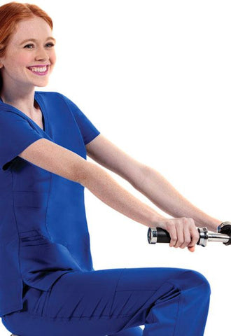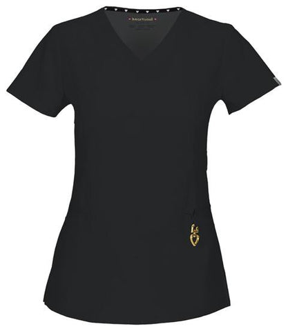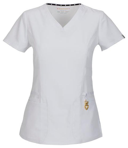A Contemporary fit V-neck top features rounded patch pockets, interior pockets, utility loops, HeartSoul signature black and white woven neck tape, front and back princess seams and an easy to remove HeartSoul logo carabiner. Center back length: 25 1/2"
