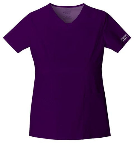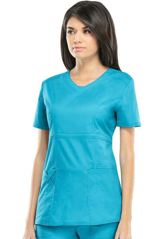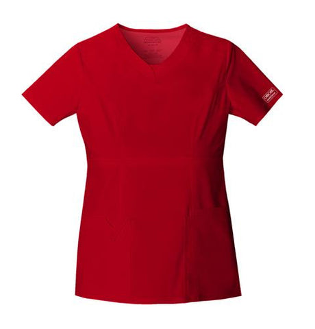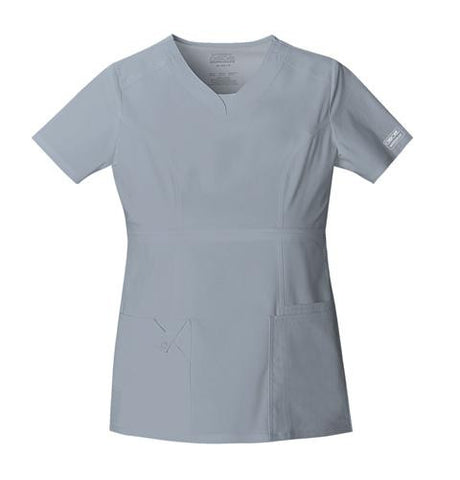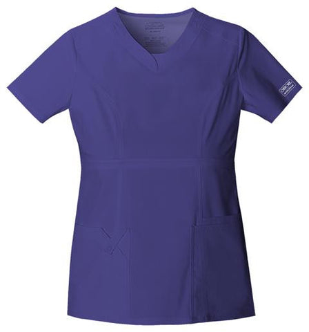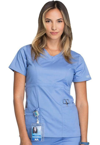 A Contemporary fit empire top features rounded V-neckband with a dickie inset, yoke panels, front and back princess seams. It also features multiple patch pockets; wearer's right has stylized double pocket with twill tape loop and left has an additional cell phone pocket. Double needle topstitching and side vents complete this fun, youthful top. Center back length: 25"