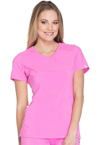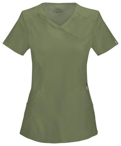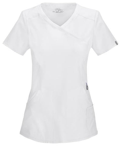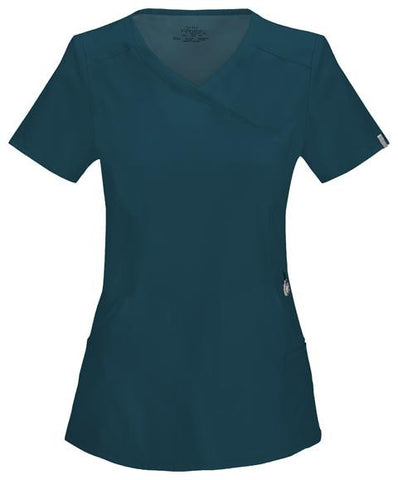 A Contemporary fit mock wrap top features two set-in front pockets, a logo O-ring above left pocket, left scissor pocket, one interior pocket, front and back princess seams, and side vents. Stretch rib knit at the center back panel gives this top its slimming shape and allows for extra movement and comfort. Center back length: 26"