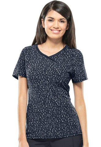 A Contemporary fit mock wrap top features two set-in front pockets, one interior pocket, front and back princess seams, and side vents. Stretch rib knit at center back panel gives this top its slimming shape and allows for extra movement and comfort. Center back length: 26"