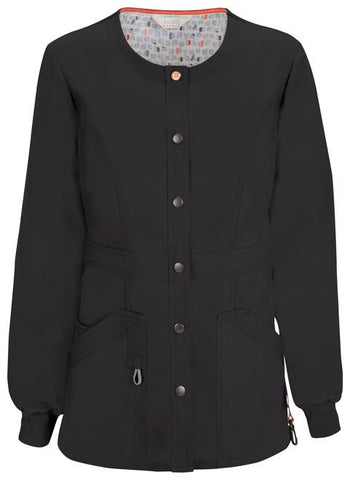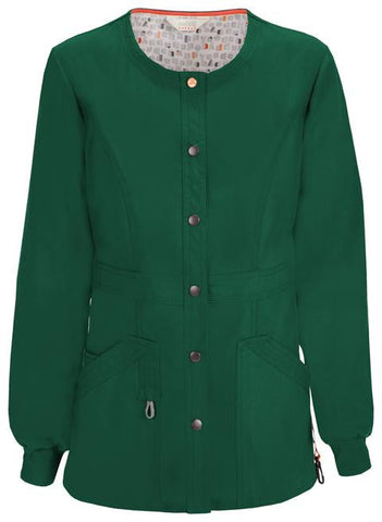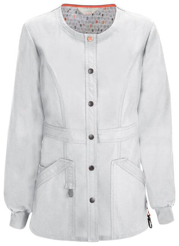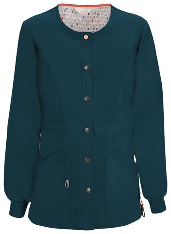 A Contemporary fit warm-up jacket features a snap front closure with one logo snap, princess seams, multiple patch pockets, a bungee I.D. loop, hidden logo tape with plastic key clasp inside left pocket, rib knit cuffs, signature mesh binding at the back neck and double needle topstitching. Also featured are a printed inside pocket and back moon facing. Center back length: 28"