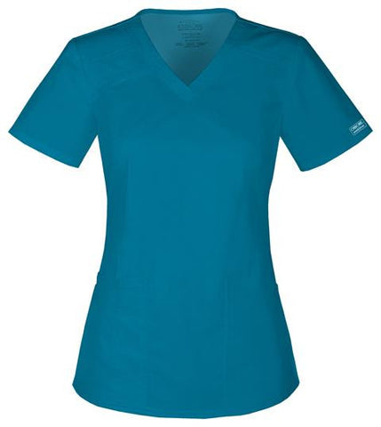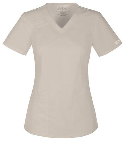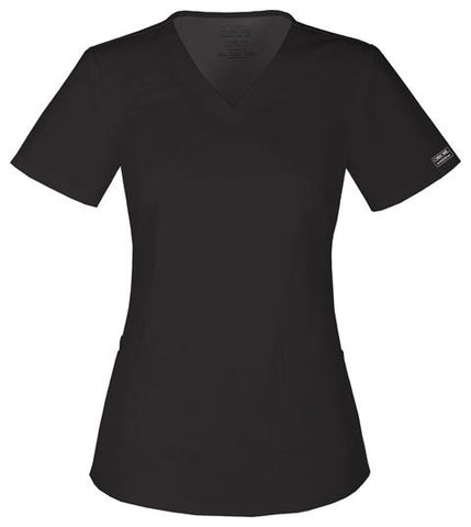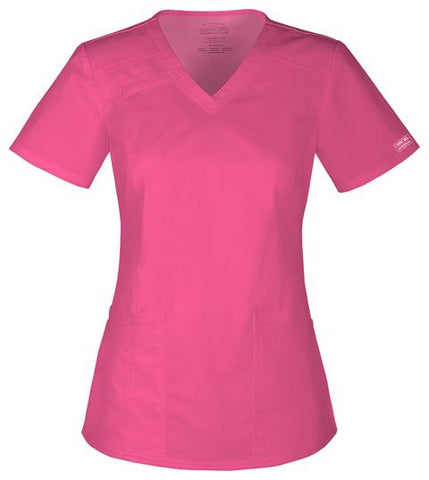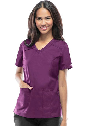 A Modern Classic fit V-neck top features front shoulder yokes with an I.D. badge slot, a stethoscope loop, patch pockets, an interior pocket, a pen slot and a back pocket. Also featured are front and back princess seams, side vents and double needle topstitching. Center back length: 26"