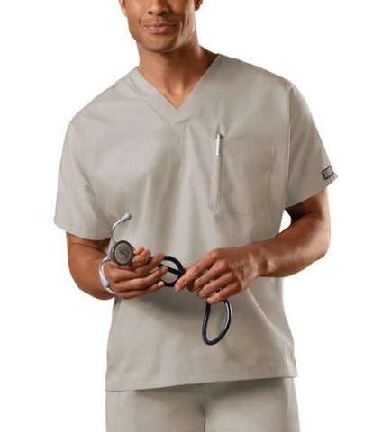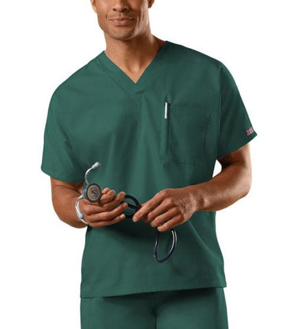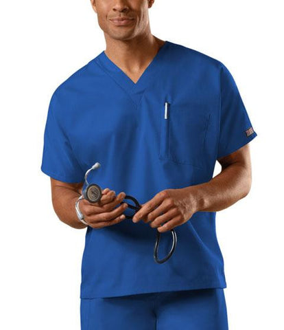 A dolman sleeve, V-neck Unisex tunic has a chest pocket with a pencil slot. Center back length 27.5".
