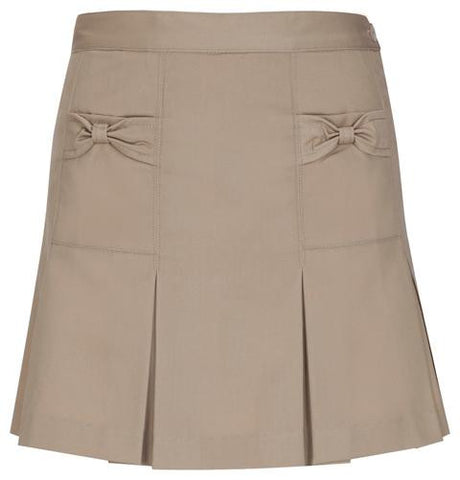 Twill scooter with bow pocket detail, four-pleat front, full elastic back with two flat seams, built-in poly knit shorts. Easy care 65% Poly/35% Cotton twill. Imported. Also available in 55980 (Toddler 2T-4T), 55982A (Girls 7-16), and 55983 (Plus 8 1/2-20 1/2).