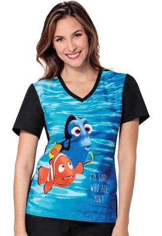 A Modern Classic fit V-neck top features stretchy side panels in contrast knit. The neckband, sleeves and center back panel are all done in a contrast solid fabric. Also featured are inseam pockets. Center back length: 25 1/2"