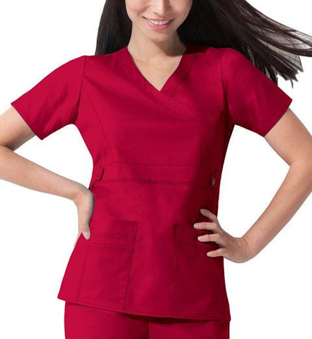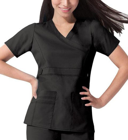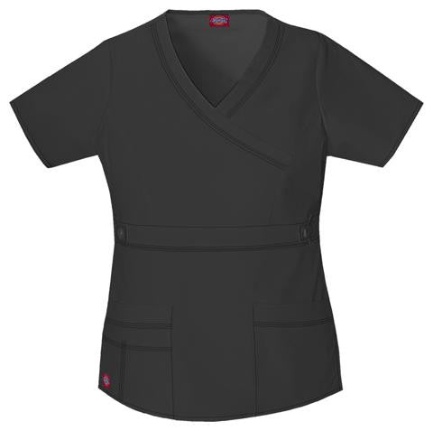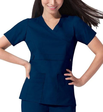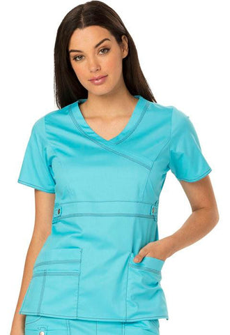 A Contemporary fit mock wrap top features princess seams for added shaping, non-functional snap details, two large patch pockets, multi needle contrast topstitching (White takes tonal topstitching), multi sectional pockets for accessory storage and side vents. Center back length: 25 1/2".