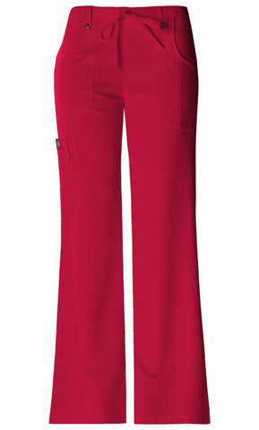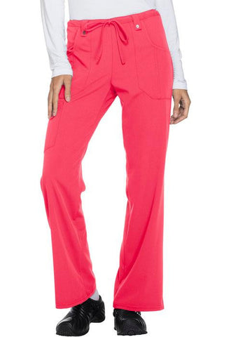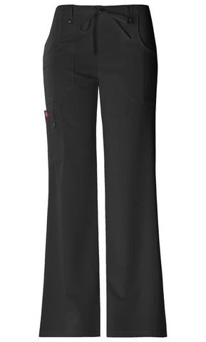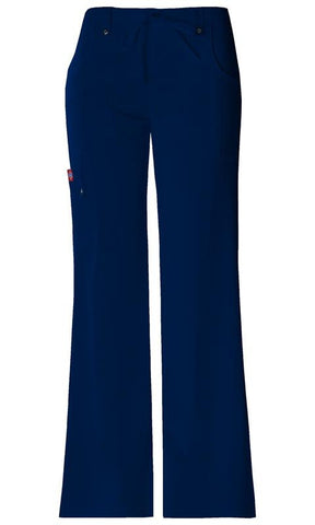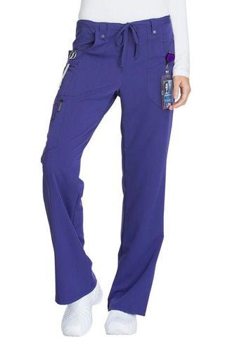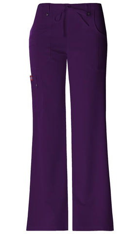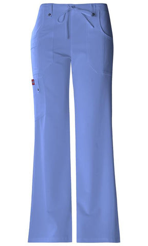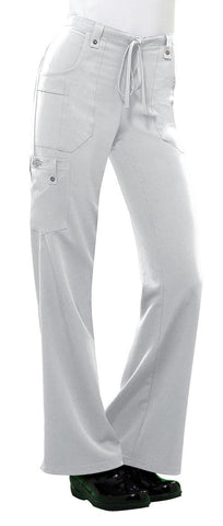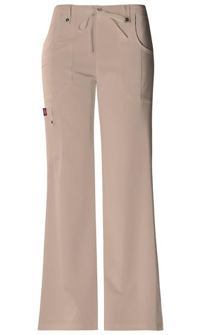 A Contemporary fit, mid rise, moderate flare leg pant features an adjustable drawstring with full elastic waist, and belt loops with decorative logo eyelet detail. Also featured are two patch pockets with pen slots in the right pocket, and a cargo pocket with self loops and logo eyelet. A back leg seam gives a flattering shape, and a back pocket and side vents complete the look. Inseam: 30 1/2".