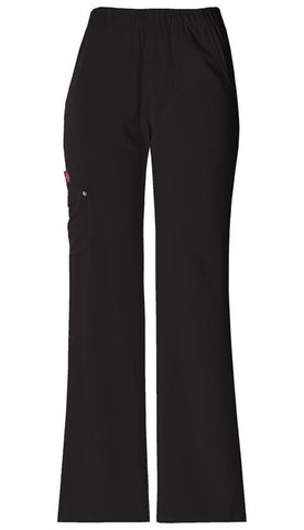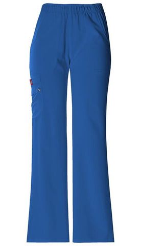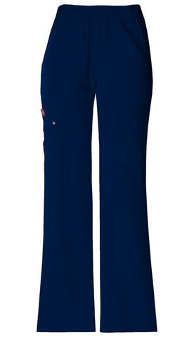 A Contemporary fit, mid rise (low rise flipped down), moderate flare leg pant features a flip-down Dickies logo elastic waistband. Also featured are two front pockets and one cargo pocket finished with pen slots and decorativelogo eyelet snaps. Inseam: 33 1/2".