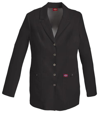 A Contemporary fit, notched lapel lab coat features front and back princess seams, patch pockets with snap tab detail and back belt tabs. Center back length: 28".