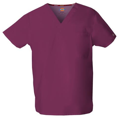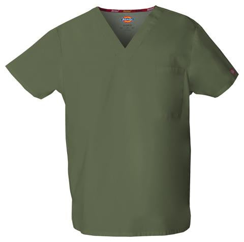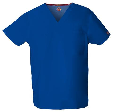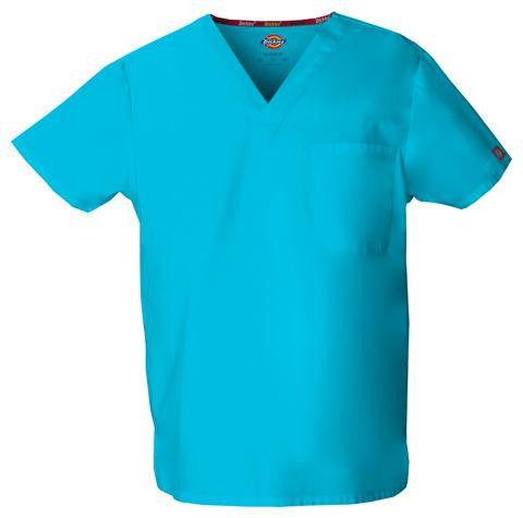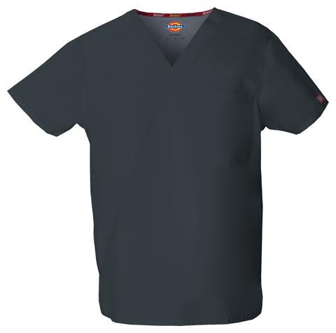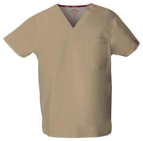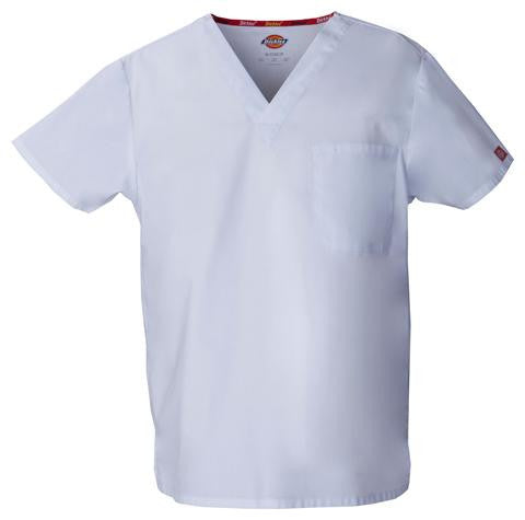 Unisex V-neck top features Dickies logo twilltape at the back neck, a front chest pocketwith a bar-tacked pencil slot and side vents. Center back length: 28".