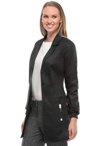 A Contemporary fit button front lab coat features a notched lapel, rib knit cuffs and princess seams to add shape. Also featured area bungee loop on the collar, four patch pockets (one with a functional snap closure for extra security) and pen slots. Center back length: 32".