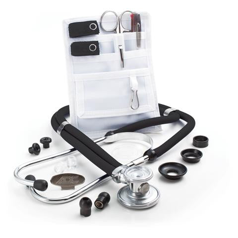 ADC's best selling Pocket Pal II kit with the legendary Adscope Sprague stethoscope.The Nurse Combo features: Pocket Pal II (216). 5 1/2" Lister Bandage Scissor (301). 3 color pen (392). Adlite Disposable Penlight (356W). Adscope 641 Sprague scope with 22" tubing color coordinated to the Hook & Loop tags and a 9 piece accessory kit.