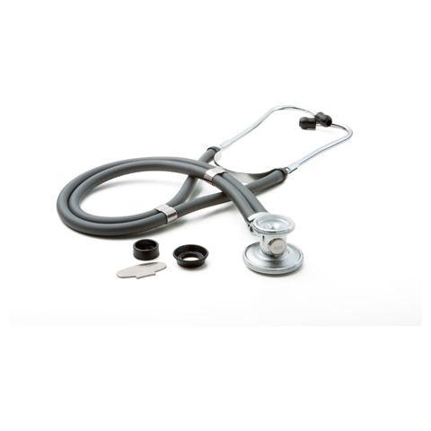 Adscope 641 Sprague Stethoscope. Features: Threaded chestpiece drum of chrome plated zinc permits the use of 5 interchangeable chestpiece fittings - adult and pediatric diaphragms, and 3 bells; (1 1/4", 1", 3/4") - for complete diagnostic capability on most patients. Complete with an accessory pouch to hold the bell chestpieces, chestpiece key, 2 spare diaphragms, one pr. of mushroom eartips, and one pr. of silicon eartips, Wt.7 oz., length 30"/5 Yr.Warranty.