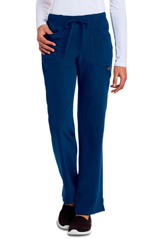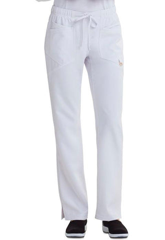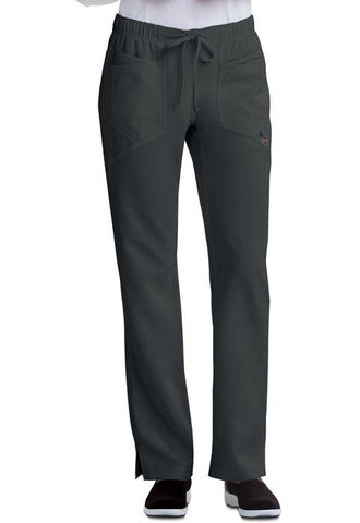 A Contemporary fit, low rise, straight leg pant features a functional drawstring, elastic waist, angled patch pockets, small interior pocket, instrument loop, and back patch pocket with a signature logo button charm. Side vents complete this look. Inseam 30 1/2".