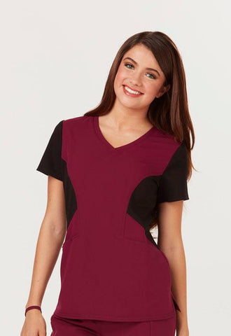 A Contemporary fit V-neck top features angled pockets with a removable wristlet inside the right pocket, gold foil branding, an exterior signature logo charm and signature woven tape at the back neck. Also featured is a contrast ponte knit at the side contour panels and sleeves, double needle topstitching and side vents. Center back length: 26".