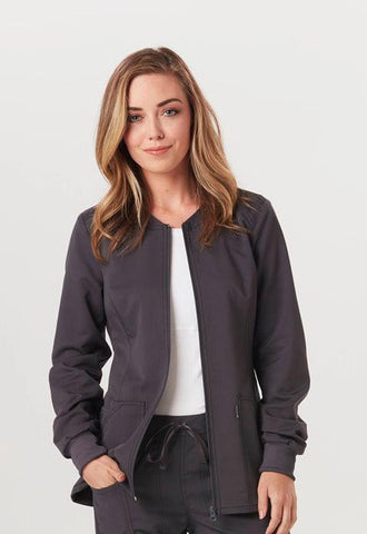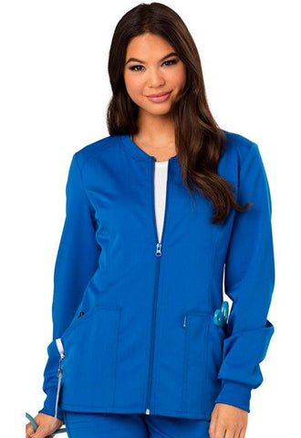 A Contemporary fit, zip front warm-up jacket features multifunction pockets that hold all your gear, along with an inside snap-closure pocket that reveals the message, smile, love, connect. Also featured is an instrument loop and rib knit cuffs. Center back length: 27