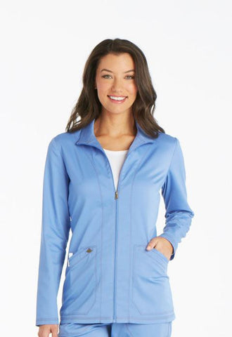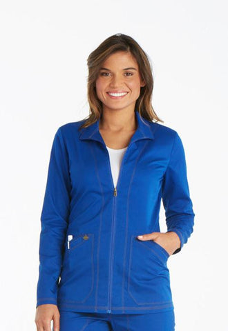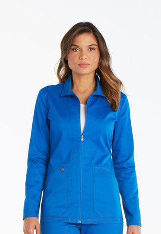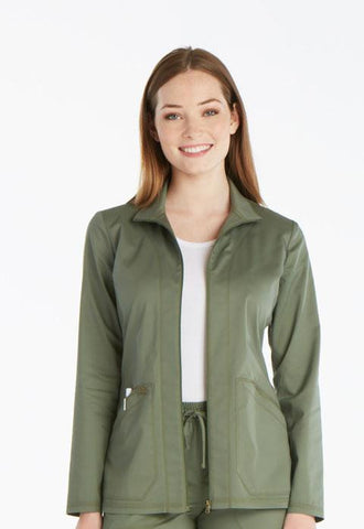 A Contemporary fit zip front warm-up features angled patch pockets with printed twill tape and back princess seams. Also featured are a printed twill tape locker loop inside the back neckline, a Dickies logo camo print facing and double and triple needle topstitching. Center back length: 27