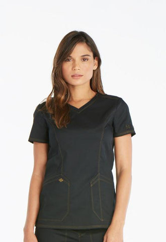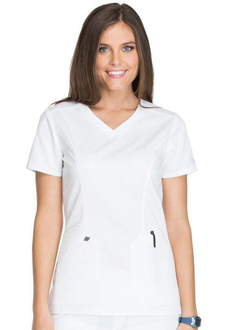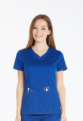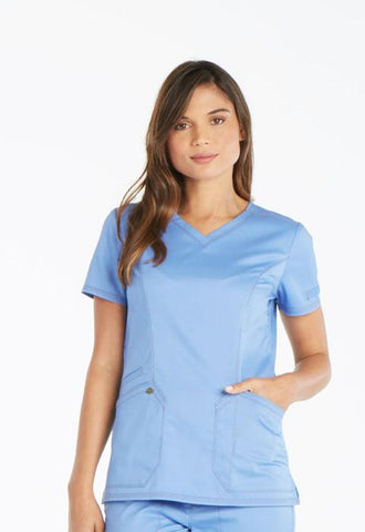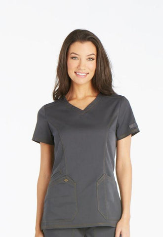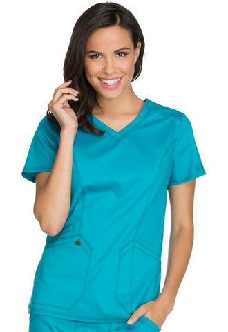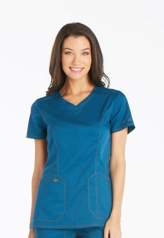 A Contemporary fit V-neck top features angled patch pockets and a printed utility loop inside the right pocket and on the left sleeve. Also featured are front and back princess seams, a Dickies logo camo print facing, double and triple needle topstitching and side vents. Center back length: 26