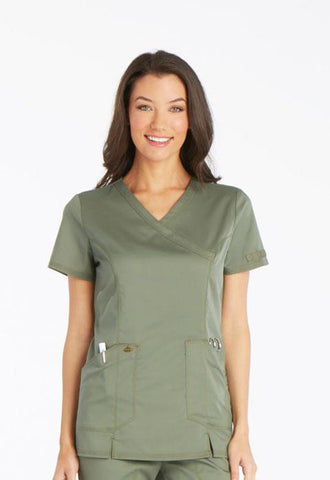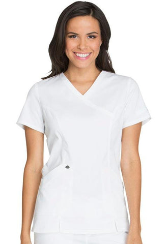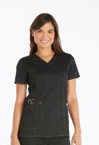 A Contemporary fit mock wrap top features a V neckline, angled patch pockets, a scissor pocket with grommet and a printed utility loop inside the right pocket and on the left sleeve. Also featured are front princess seams, a Dickies logo camo print facing, double and triple needle topstitching and front vents. Center back length: 26
