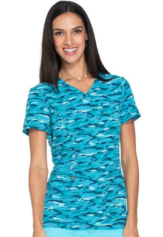 A Contemporary fit V-neck top features angled patch pockets, and a printed utility loop inside the right pocket and on the left sleeve. Also featured are front and back princess seams, Dickies logo camo-print facing, side vents, and double- and triple-needle topstitching. Center back length: 26